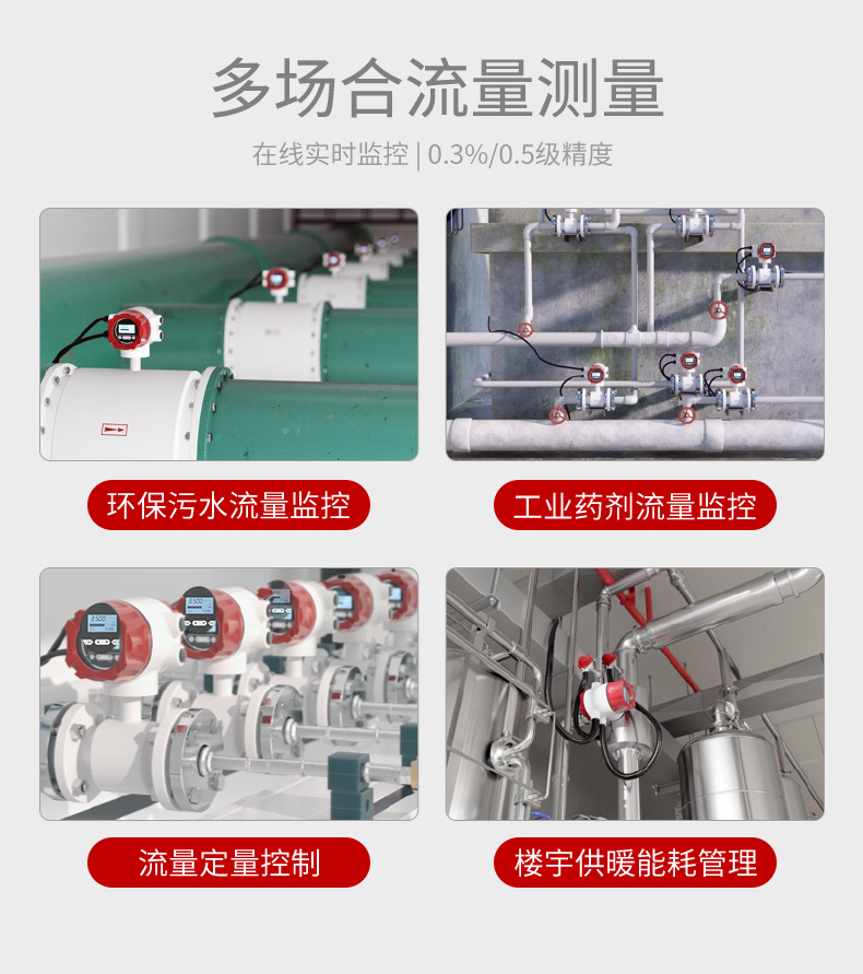 电磁流量计基于法拉第电磁感应原理设计,用于直接测量封闭管道内导电液体的瞬时流量,并具有流量累积功能。在进行现场监测显示的同时,可输出标准的电流信号、脉冲信号和 RS485 数字信号,供记录、调节、控制使用,实现检测自动控制。可广泛应用于自来水、化工、煤炭、环保、轻纺、冶金、造纸等行业。