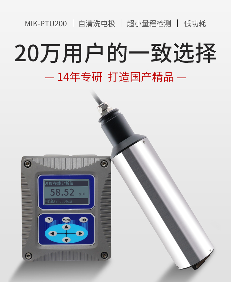 红外双散射光线技术不受色度影响测定浊度值。根据使用环境可以选配带自清洗功能。数据稳定,性能可靠;内设自诊功能,保证数据准确;安装和校正简单。
