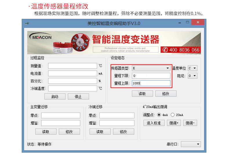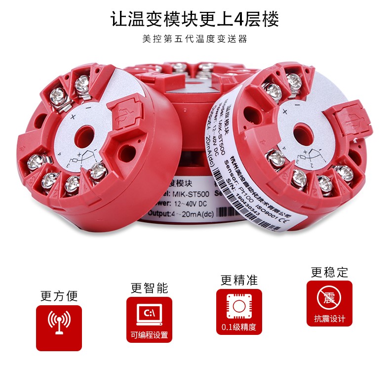 MIK-ST500作为新一代的温度变送枢纽,他的兼容性和精度远远领先同类温湿度变送器,通过V6编程线连接电脑USB端口,可由电脑监控数据并调整对接的传感器类型和量程上下限,其所提供的全面单点测量解决方案,包括了PT100,CU50及各类热电偶。顶部安装式智能温度变送器,用于热电阻(RTD)、热电偶(TC)、电阻(Ω)、电压(mv)信号输入,将各种输入信号转换为4-20MA输出信号。
