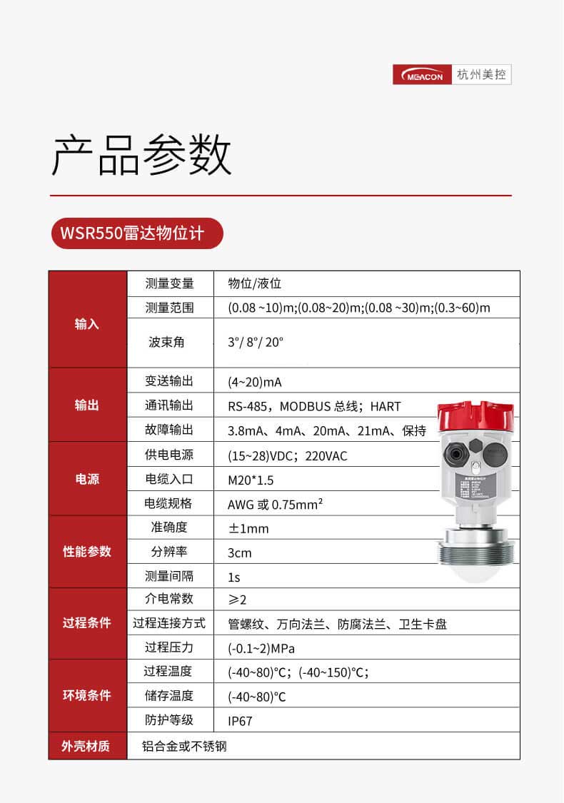 WSR310雷达液位计是调频连续波(FMCW)雷达产品,可以对工业生产过程中封闭式或敞开容器中液体的高度进行非接触式连续测量。 检测距离远,波束能量低,可安装于各种金属、非金属容器或管道内。雷达液位计对人体及环境均无伤害,还具有不受介质比重的影响、不受介电常数变化的影响、不需要现场校调等优点。